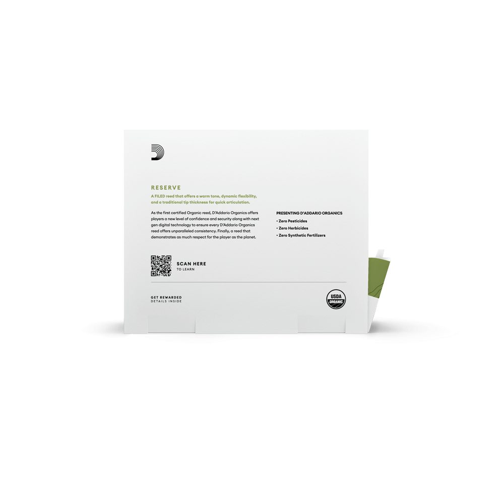 Organic Reserve reeds provide you with dynamic flexibility and exceptional, warm tone quality when playing due to their long vamp profile. These filed reeds feature a traditional tip to give you an ease of articulation and response. Each reed in the pack comes single-sealed in a recyclable paper reed holder and flow wrap.