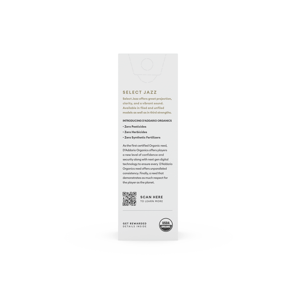 Organic Select Jazz offers great projection, clarity, and a vibrant sound. Available in filed and unfiled models, Select Jazz is sold in third strengths for optimal mouthpiece pairing. Each reed in the pack comes single-sealed in a recyclable paper reed holder and flow wrap.