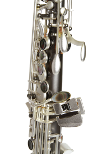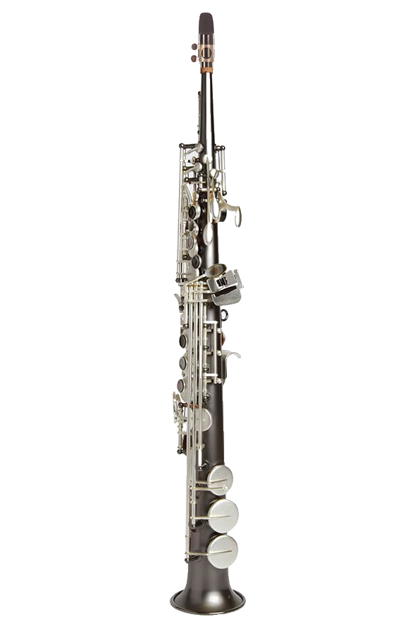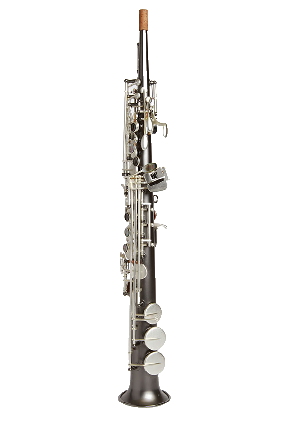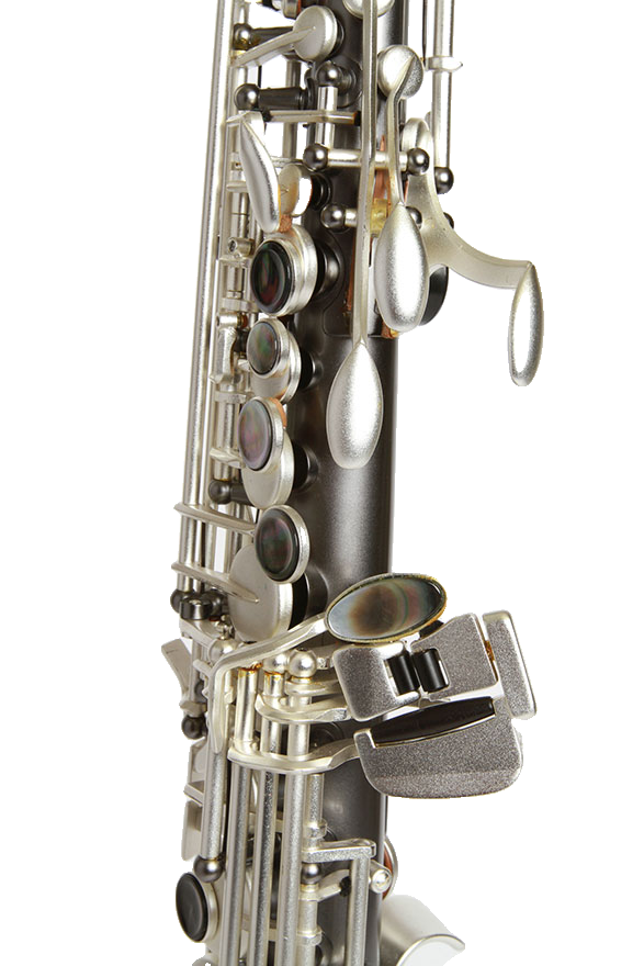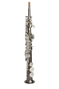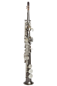 One piece straight body Soprano saxophone, no steps in the tube and no collar screws. Post to body construction. Available in Gray Onyx with Satin Silver Keys and Trim.