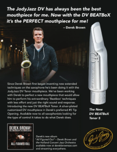 Since Derek Brown first began inventing new extended techniques on the saxophone he’s been doing it with the JodyJazz DV Tenor Mouthpiece. We’ve been working with Derek to perfect a new mouthpiece that would allow him to perform his extraordinary ‘Beatbox’ techniques with less effort and just the right sound and response. Introducing the new DV BEATBoX Tenor. A Palladium-plated customized DV mouthpiece in Derek’s preferred #5 tip opening. Available now to all saxophonists looking for the type of control it takes to do what Derek does.