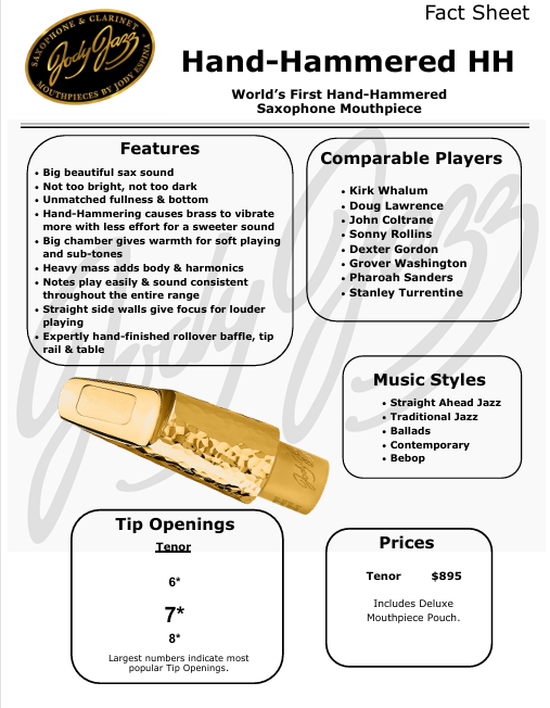 Our goal in designing the HH Tenor was to make a saxophone mouthpiece that would appeal to the majority of players because of where it sits in the tonal spectrum. If you play traditional Jazz and ballads, you will love this piece and if you play more contemporary music requiring a brighter sound and more volume you can love this piece also. It is not the brightest or darkest mouthpiece, but it is in the middle where most players find it perfect.