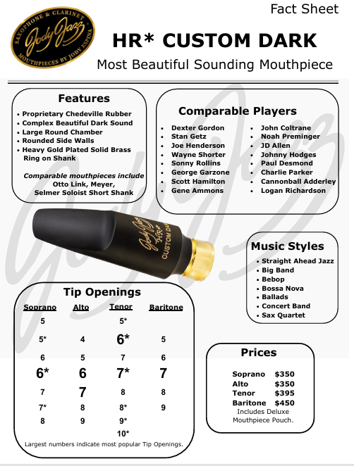 The HR* CUSTOM DARK Series is our premium line of hard rubber saxophone mouthpieces, where the goal was to make the most beautiful sounding and playing pieces that we possibly could. As Soprano saxophone players, we know there are often a lot of unpleasant highs in the sound, especially on the higher notes. With the HR* CUSTOM DARK Soprano, we retained the fun of playing a great Soprano mouthpiece while taking all the unpleasant highs off. In order to achieve this goal, we started with the finest material used in hard rubber mouthpieces today, which is our proprietary Chedeville® Rubber. CHR (Chedeville Rubber) is a softer purer formula than regular standard hard rubber. This rubber imparts a rich warm sound.