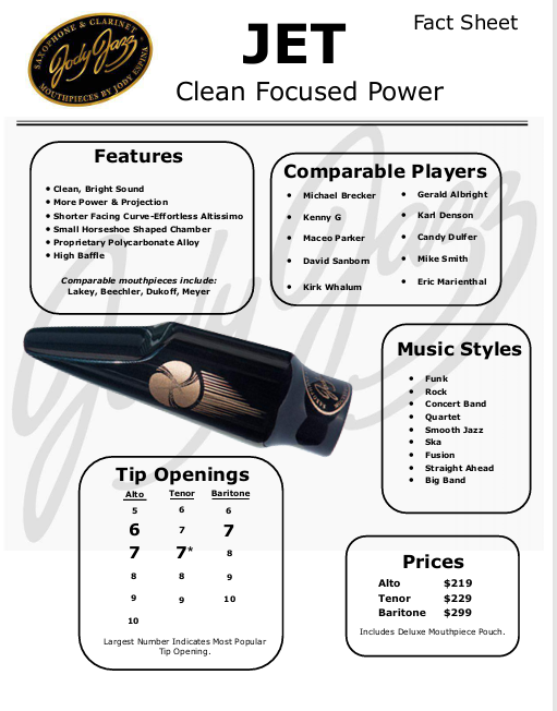 The JET is a bright saxophone mouthpiece with excellent projection, extra easy altissimo register and yet can be played with a warm versatile feel. The JodyJazz JET Alto Saxophone mouthpiece is free blowing, easy and fun to play mouthpiece that captures the full range of tonal qualities of the instrument. The JET has a clean, focused sound with strong projection and cut, while maintaining extraordinary versatility. The JodyJazz JET is excellent for Rock, Funk, Blues, Smooth Jazz and Latin Music, Reggae, Ska, Funk, Hip Hop, Top 40, Duranguense, Merengue, Salsa, Cumbia, Compa, Tejano, Musica Popular Brasileira, but at the same time we think that many alto sax players will be surprised at how well it plays lead alto in a big band and due to it’s versatility, blends nicely with a concert band or saxophone quartet. In other words the JET is a great saxophone mouthpiece that seems to appeal to a very broad variety of players. The thing to remember is that no two players are alike so that it’s all about finding the mouthpiece that responds to your morphology (physical makeup). Morphology means that you have a chamber in your mouth and throat which reacts with the mouthpiece so some people sound better on a small chamber mouthpiece like the JET and some people sound better with a larger chamber piece like the JodyJazz HR*.