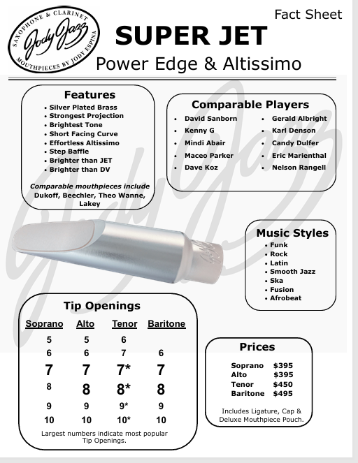 The SUPER JET is a Palladium-plated Brass Mouthpiece developed specifically with the Rock, Funk, Latin and Smooth Jazz player in mind. It’s a very contemporary sounding mouthpiece with many characteristics we have not offered in our range up until this time. It’s going to give you more power, more edge and more altissimo. But as with all of our mouthpieces it is beautifully free blowing with enough bottom in the sound to make it more versatile than many mouthpieces in this category of small chamber pieces. The SUPER JET also features a shorter facing curve for insane altissimo.