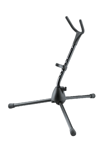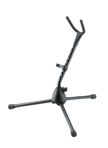 Adjustable folding stand for curved Soprano Saxophones. Fiberglass reinforced plastic base. Flexible upper support arm for different bell sizes. All instrument support parts covered with exclusive non-marring plastic coating.