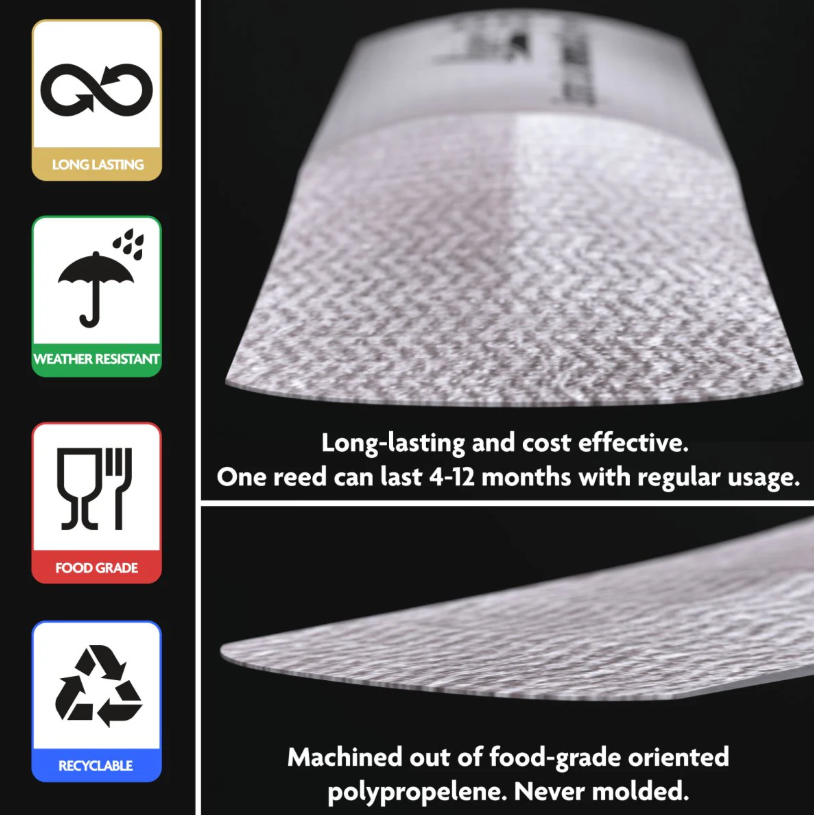 Our reeds are made from a special formulation of polypropylene—a non-toxic, food-safe polymer you’ll also find in medical equipment, yogurt cups, and packaging. On its own, polypropylene is far too flexible for a reed. So we strengthen it through a process called orientation, which aligns the polymer fibers to dramatically increase stiffness. That’s the secret to the signature feel and response of a Légère reed.