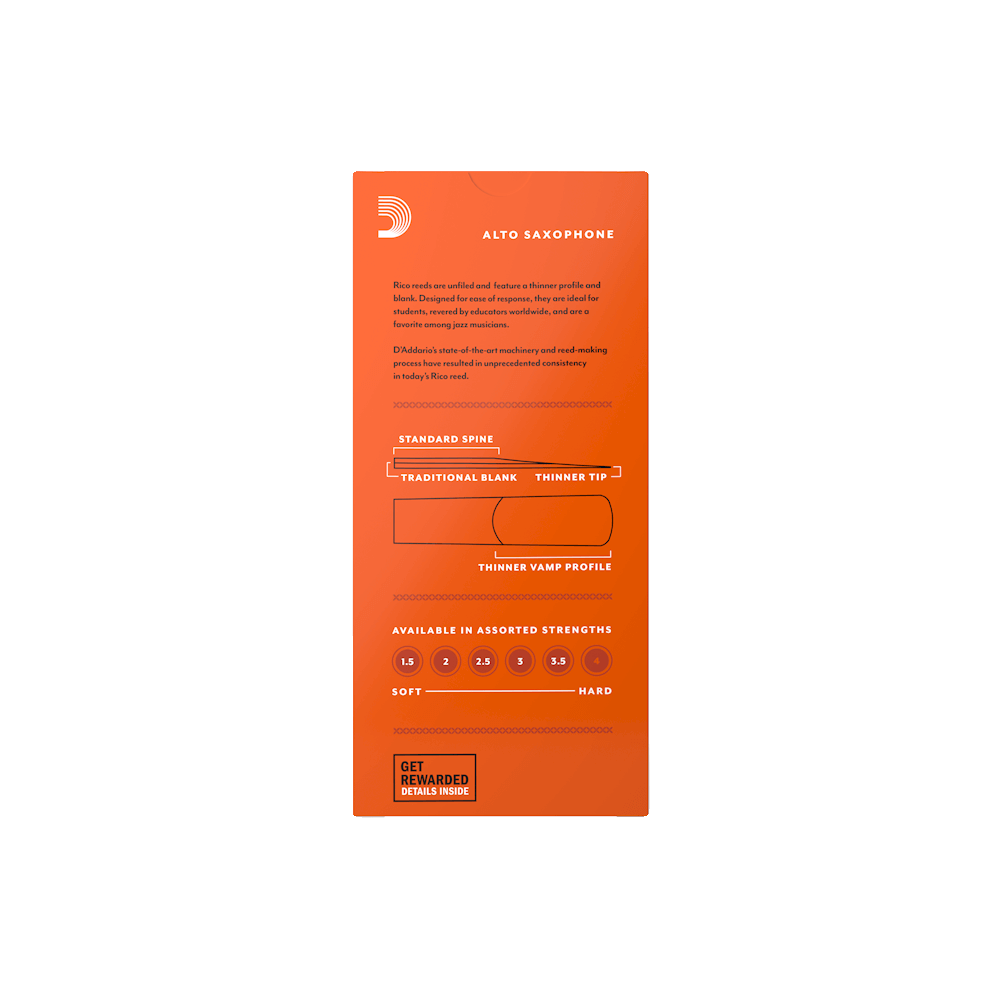 Rico by D’Addario Alto Saxophone reeds are crafted with beginners and educators in mind, thanks to their traditional blank and profile for ease of response, plus unfiled cut for added support. These reeds are available for a full range of clarinets and saxophones to best suit your playing needs.