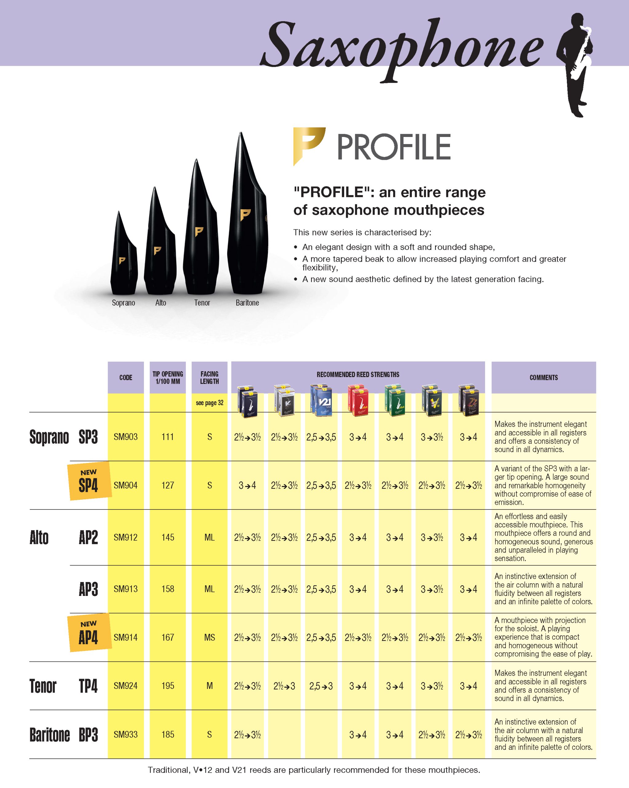 Vandoren Profile mouthpieces combine a round, resonant sound, strong projection, and dynamic response in a sleek, modern design. Drawing on Vandoren’s long mouthpiece tradition, they deliver a clear, present tone while preserving the warmth and ease players rely on. Profile mouthpieces are crafted to meet the needs of today’s classical saxophonists, offering flexibility and refinement across all classical genres from standard repertoire to contemporary works.