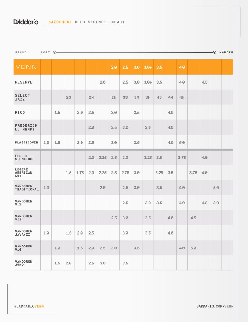D’Addario Woodwinds will ship you a FREE alternate strength of VENN with your proof of purchase through the VENN Alternate Strength Program. Click here to fill out the form.