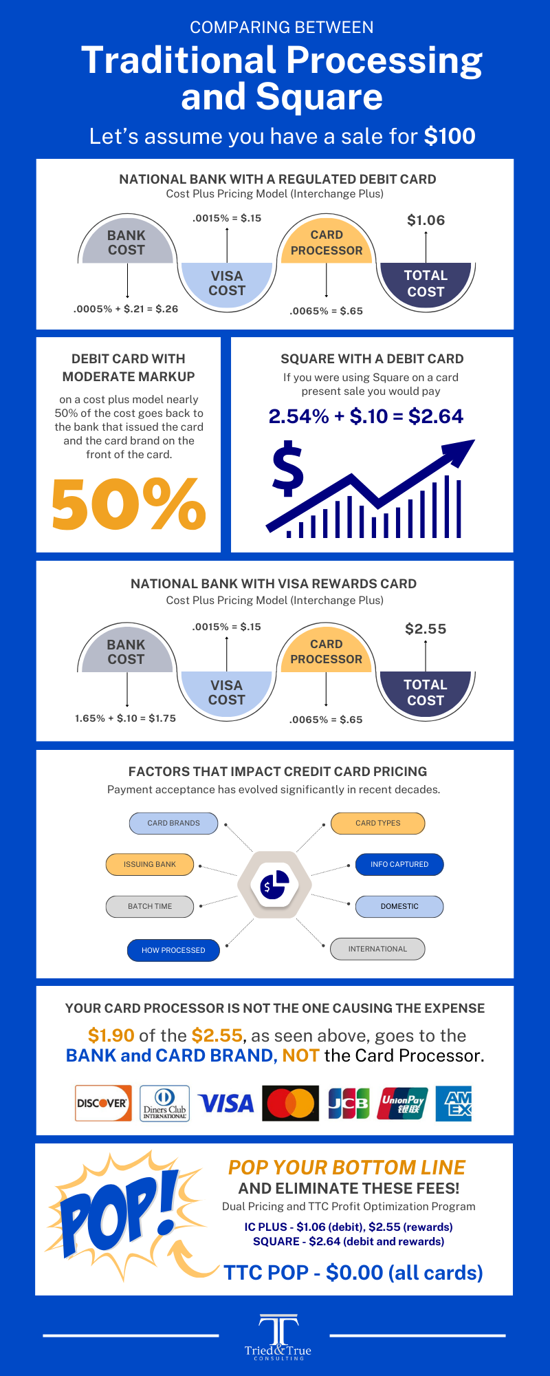 At Tried & True Consulting we will review your current needs, if you are accepting cards determine who is buying from you, what cards they use, look for ways to reduce expense and risk and then determine which pricing method will work best for you.
