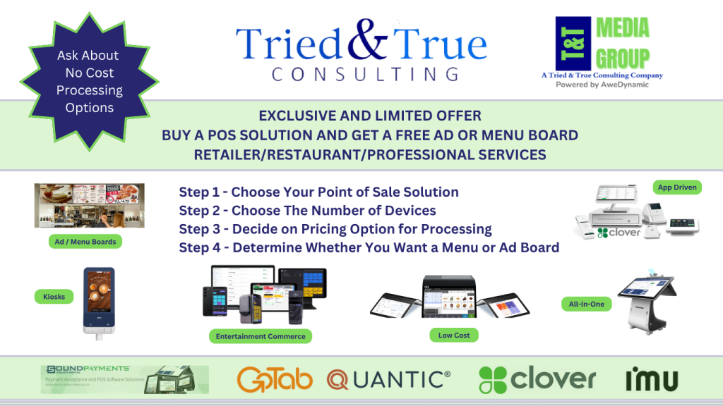 We offer point of sale solutions and an exclusive Tried & True Merchant Club program that includes: Hardware, Supplies, Warranty, Support and Consulting services for one monthly fee.